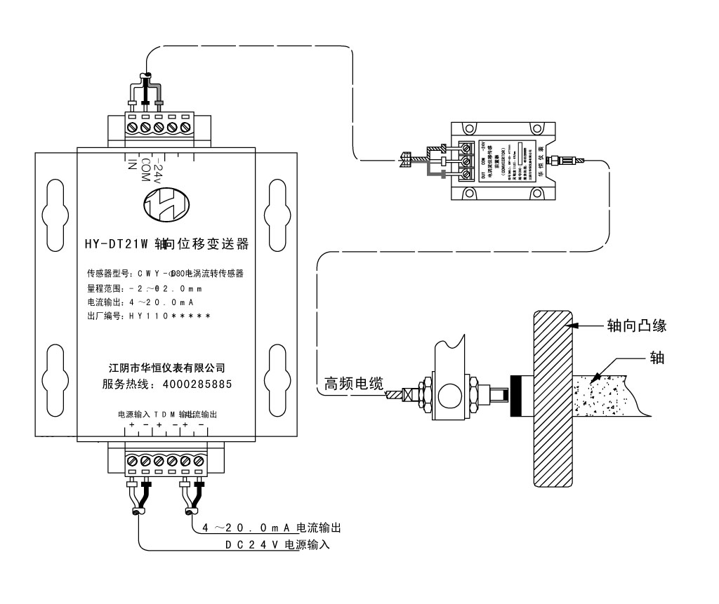 HY - DT21系列位移變送器配合CWY - DO電渦流傳感器,主要測量各類旋轉機械的軸向位移和脹差,輸出標準的4~20 mA電流信號,送給PLC、DCS 系統(tǒng)。